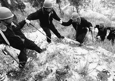 漫天飞舞的雪花覆盖了崎岖的山路,让上山变得更加困难。班长唐宏走在前面,为大家探路,他说:“雪中登山,摔跤是家常便饭。”