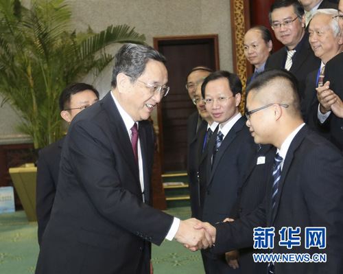 2013年12月22日,中共中央政治局常委、全国政协主席俞正声在北京会见出席2013海峡两岸媒体前瞻论坛的代表。 新华社记者丁林摄