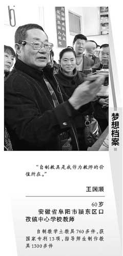 “三尺讲台是我的田园,既然庄稼人不怕顶风冒雨,那么教师就要经历困难和挫折。唯其如此才能用自己的人格魅力感染和熏陶一代又一代人。”王国顺是安徽省阜阳市颍东区口孜镇中心学校教师,他的办公室里常有各种用矿泉水瓶、旧纸盒、废弃的金属及泥土等原材料制成的组合模型,乍看粗糙,经了解才知道是王老师花时间下功夫制作的教具。他自制教学土教具760多件,获国家专利13项,指导师生制作教具1300多件。