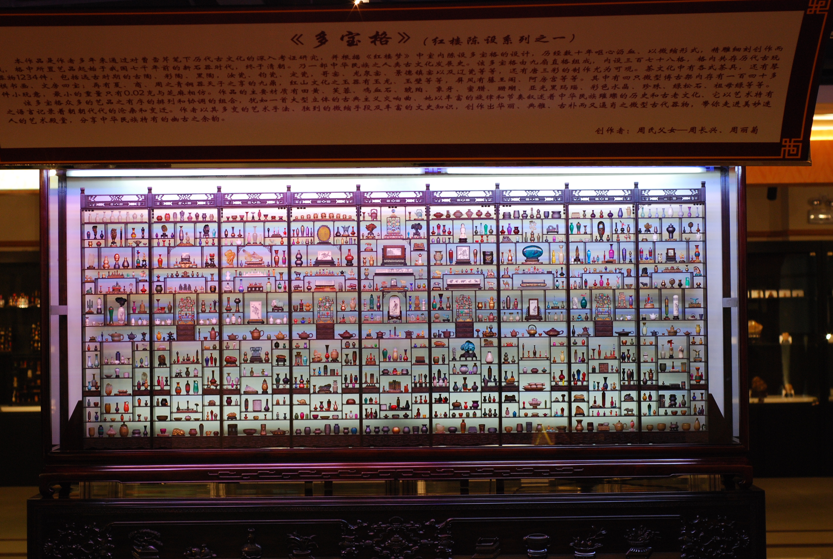 1985年,刚刚退休的周长兴作出了一个重大的决定:要创作一套传世之作,选题上经过反复的考究,最终选择《红楼梦》,这部中国古典文学的巅峰之作,也是中国古典文化的浓缩。我们看到,周长兴将曹雪芹笔下的家具、彩陶、青铜、瓷器、玉器、茶具、文房四宝、琴棋书画等共记8000余件陈设品,以5:1、10∶1、20∶1的比例按书中的场景再现了原貌。在微雕浓缩的方寸之间,林黛玉的花锄、焚稿炉,贾宝玉玩弄的胭脂粉盒,在周长兴的刀下演变成了一件件指尖大小的掌上“玩艺儿”。怡红院的倜傥、潇湘馆的凄美、秋爽斋的豪放,被大师表现的淋漓尽致。