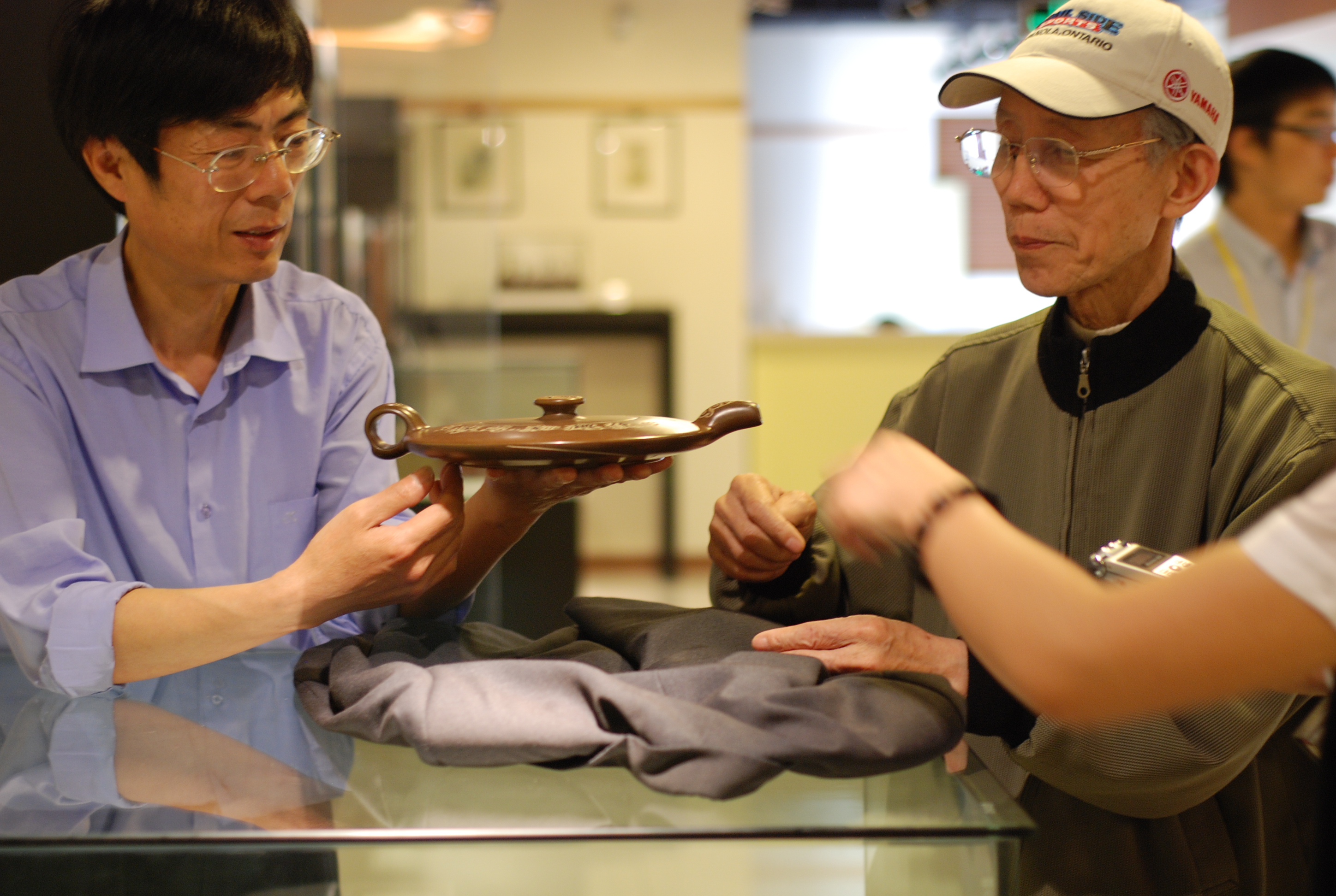周长兴大师还有一项叫人称绝的技艺就是制作石壶。据了解“周氏石壶以紫砂壶艺为源,中华文化为本,是在继承和发扬紫砂壶精髓的基础上,历经数十年不懈的探索,精心制作而成的,堪称是壶中精品、中华奇葩。” 石壶雕刻不同于紫砂壶的制作,由于天下没有完全相同的两块石头,因此周长兴往往要根据石材的特性和形状来构思设计。石雕的特性又决定了石壶制作时只能做“减法”,雕刻时必须壶嘴、壶柄、壶身和壶盖有一个恰当的比例,要根据出水的流畅和控制功能的需要,刻出斜度,制作上稍有考虑不周,就有可能影响使用功能。石壶雕刻的技巧在于要将石壶的实用性融于雕刻艺术之中。其基本技法有圆雕、浮雕、透雕,及深刻、浅刻,线刻等。制作出好的石壶不仅要有精湛的技艺,更要具备极高的艺术修养。周长兴对石壶的雕刻要求很规范,虽然最小的石壶仅赤豆般大小,重0.24克,但壶上浮雕,或为商周青铜纹器,或为梅桩、束柴,都极细致。这样的石壶他雕了2000多件(套),而每件作品,要花费十几乃至上百个小时。其纤巧绝艺令人叹服。三友束紫壶、阴阳八卦束竹壶、葫芦提梁壶、双身壶、顽石壶等都是周氏石壶的代表作,每一把石壶都独具匠心,且非常实用,周长兴拿出一只石雕扁壶,用一根火柴棒将壶盖上的小眼堵住,一边用口吸住壶嘴,一边用手捏紧壶盖,只见沉重的石壶被慢慢提起。由此可见,石壶雕凿是多么的精细入微!