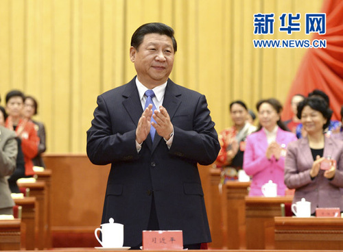 2013年10月28日,中国妇女第十一次全国代表大会在北京人民大会堂开幕。中共中央总书记、国家主席、中央军委主席习近平在主席台向与会代表鼓掌致意。新华社记者 马占成 摄
