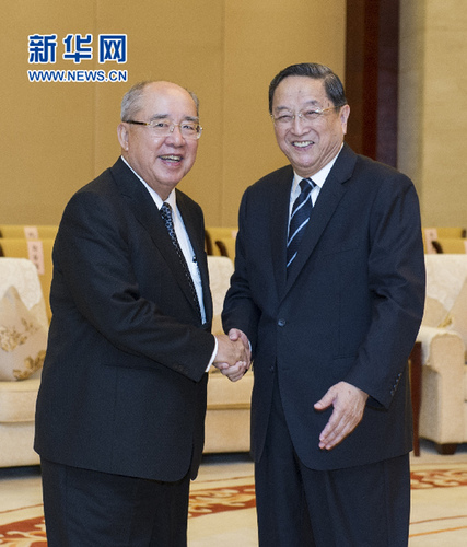 10月25日,中共中央政治局常委、全国政协主席俞正声在南宁会见前来出席第九届两岸经贸文化论坛的中国国民党荣誉主席吴伯雄一行。新华社记者 王晔 摄