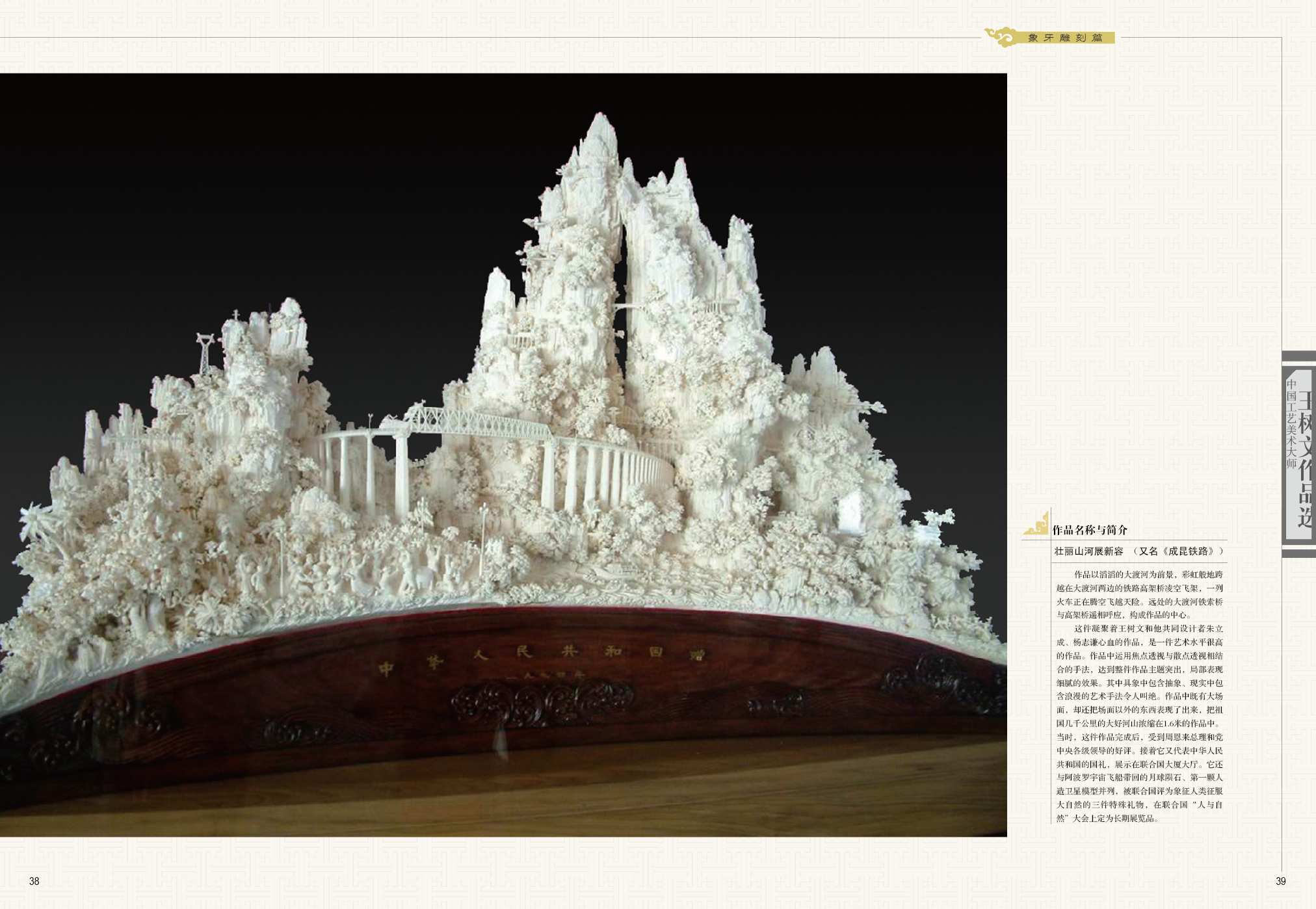 上世纪70年代初,我国恢复了联合国的合法席位,国家领导人决定赠送两件意义特殊的礼品给联合国:一件是反映我国悠久文明史的长城挂毯,一件是反映我国社会主义建设成就的大型象牙雕刻作品。经过招标比稿,以王树文为设计制作总指挥的牙雕作品在十几家送稿单位中脱颖而出。这件作品由朱玉成、杨志谦和已故的中国工艺美术大师杨士惠、杨士忠共同创作完成,并命名为《万里山河展新容》。整件作品用八支象牙拼接而成,把立体雕刻和浮雕手法结合在一起,将西洋焦点透视和中国散点透视技法巧妙的结合起来,运动的火车与崇山峻岭、悬崖峭壁、古木苍松、桥梁道路紧密相连,总长1.5米的作品展现出万里江山雄伟壮观的磅礴气势,代表了当时中国象牙雕刻工艺的最高水平。此件作品被长期展示于联合国大厅,供世界人民瞻观。