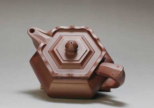 二是“形”。紫砂壶之形,是存世各类器皿中最丰富的了,素有“方匪一式,圆不一相”之赞誉。如何评价这些造型,也是“仁者见仁,智者见智”。因为艺术的社会功能即是满足人们的心理需要。既然有各种各样的心理需要,大度的爱大度,清秀的爱清秀,古拙的爱古拙,喜玩的爱趣味,人各有爱,不能强求。我认为古拙为最佳,大度其次之,清秀再次之,趣味又次之。道理何在?因为紫砂壶属整个茶文化的组成部分,所以它追求的意境,应是茶道所追求的意境:“淡泊平和,超世脱俗”。而古拙正与这种气氛最为融洽。所以古拙为最佳。许多制壶艺人都明白这个道理,就去模仿古拙。结果是“东施效颦”。反而把自己的可爱之处丢掉了。要知道。艺术品乃是作者心境之表露,修养之结果,不是其它所能替代得了的,所以大可不必模仿。历史上遗留下来许多传统造型的紫砂壶,例如“石瓢”、“井栏”、“僧帽”、“掇球”、“茄段”、“瓜菱”、“梅椿”、“仿古”等等,乃是经过年代的冲刷,遗留下的仅存的优秀作品,拿今天的眼光看。仍然在闪烁发光。现在许多艺人在临摹,也是一个人一个样,各不相同。譬如“石瓢壶”,据不完全统计,就有一百多种,原因就是古今的艺人们,都把自己的审美情趣融进了他们的作品之中。说起“形”,人们常把它与紫砂壶艺的流派相提并论,认为紫砂壶流派分“筋囊”、“花货”、“光货”等。其实,这是极无分析的办法,道理很简单,就如戏剧表演家的流派分类,不能以他演什么戏而定,而应以他在戏剧表演中追求的趣味。艺术家在他们的艺术生涯中,一旦艺术成熟,必然形成他的个人风格,几个相差无几的个人风格凑在一起,就成了流派。艺术讲究的是感觉。一把紫砂壶造型的优劣,全凭个人的感觉,作壶讲的“等样”、“等势”就是造型学讲的“均衡”。