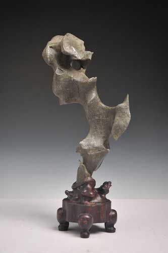 太湖石以“瘦、皱、漏、透”为美,这件石山子奇在造型曲折婉转,妙形俏影,呈凌云之势,四面可观,尽显大自然鬼斧神工之妙。且质细如玉,色青温润,极具古典赏石之美,为文房清供之佳品。