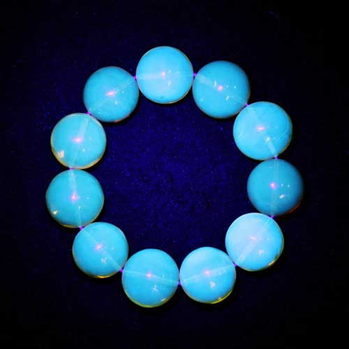 蓝珀是世界上有机宝石里唯一有荧光反应的宝石,是琥珀中的极品,有琥珀之王之称。蓝珀在白底自然光线下,是淡黄而纯净的,在变化角度时肉眼感觉到轻微蓝色反应,在深色底色和自然光线下会出现强烈的天蓝色,在紫光灯下,会出现很强烈的蓝色荧光。近年来,蓝珀的产量大幅减少而面临绝迹的可能,因此导致蓝珀的市场价格不断飙升,使其大受世界各国收藏者和珠宝商们的喜爱。此次上拍的蓝珀手串,珠粒圆润饱满均匀,琢磨精细,珠径颇大,品相完好,是收藏级佳品。