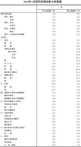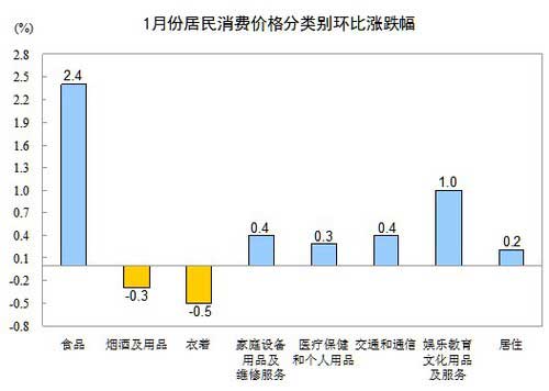 1月份,食品价格环比上涨2.4%。其中,鲜菜价格上涨12.1%,影响居民消费价格总水平上涨约0.37个百分点;鲜果价格上涨11.0%,影响居民消费价格总水平上涨约0.23个百分点;水产品、液体乳及乳制品、牛肉、羊肉和粮食价格分别上涨4.3%、1.7%、1.7%、1.3%和0.2%,五项合计影响居民消费价格总水平上涨约0.17个百分点。