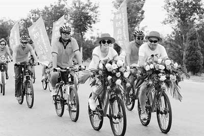 两位热心公益的“80后”年轻人(图中最前列),通过自行车健身而相识、相知、相爱,决定以低碳环保的形式给自己留下一份难忘的记忆,图为他俩别出心裁的自行车婚礼车队。 人民图片