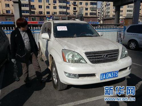 在沈阳龙之梦广场北停车场,一位市民在观看95号“车王”。这辆白色雷克萨斯越野起拍价68万元,是121辆公车中的最高价(2月11日摄)。沈阳市大东区一次性拿出121辆公车向社会公开拍卖,近期在市民中引来一场不小的“看车热”。新华社记者 王炳坤 摄