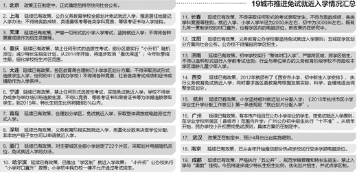 日前,在下发《关于进一步做好小学升入初中免试就近入学工作的实施意见》后,教育部进一步将工作聚焦19个大城市,印发《教育部办公厅关于进一步做好重点大城市义务教育免试就近入学工作的通知》,要求2014年制订完善进一步规范义务教育免试就近入学的方案。据悉,这19个重点大城市是指4个直辖市、5个计划单列市、10个副省级省会城市。