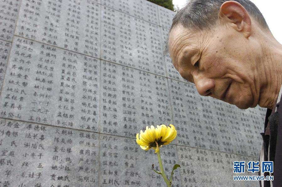2006年4月5日,74岁的南京大屠杀幸存者佘子清手捧鲜花,祭奠被日军杀害的母亲。