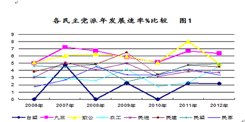 2006年到2012年7年间,各民主党派共发展成员 2893人,党派人数增长了33.5%。其中民革发展283人,民盟679人,民建591人,民进435人,农工326人,致公党233人,九三学社341人,台盟5人。各党派每年发展人数见表1;党派每年平均发展速率为4.12%,其中最快为7.22%,最慢为0,各党派发展速率见图1。