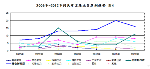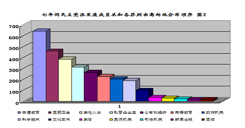 民进发展成员 仍以普通教育为主,但有下降趋势,其本身特色新闻出版和文艺界人士减低,有增高趋势的仍然是社会新阶层和政府机关人员(图7);