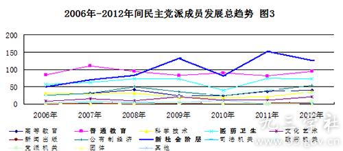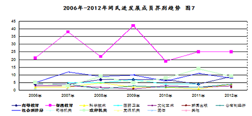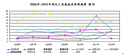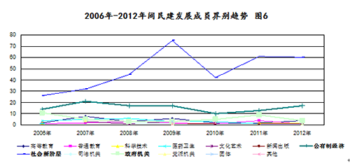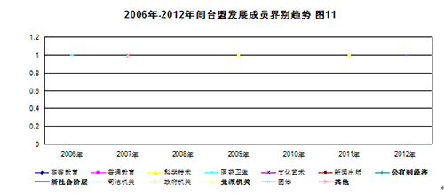 2006年到2012年,随时间推移,各民主党派发展成员界别结构走向(见图4-图11):