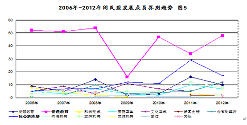 民盟发展成员中,本特色教育界成员有下降趋势,社会新阶层和政府机关成员有增高趋势(图5);
