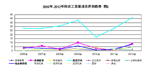 农工党发展成员 基本保持了自身特色,以医疗卫生界为主,亦有下降趋势,但社会新阶层和普通教育有上升趋势(图8)。