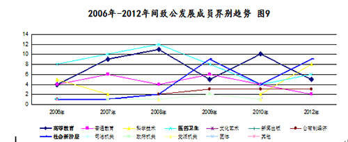 由表2年纵向看,各年度党派发展成员,新社会阶层明显有逐年走高趋势,其次是政府机关人员有走高趋势,普通教育、医疗卫生高等教育等持平,科学技术、司法机关、文化艺术新闻出版走低或在极低水平。见图3。