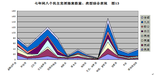 由表3纵轴和横轴比较可见,各党派提交各类型提案的比重,各党派均在管理类、文化教育类、卫生类、资源环境类提案较多,峰值最高的提案,文化体育类是提得最少、峰值最低的提案。见综合表现图13