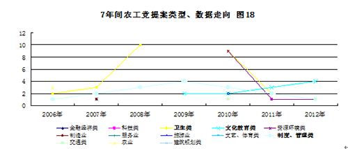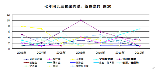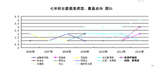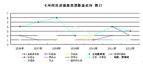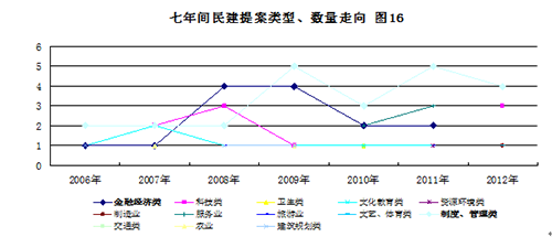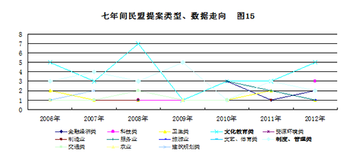 2006年到2012年七年间,各民主党派向政协提交的集体提案类型、数量走向分析见图14—图21.