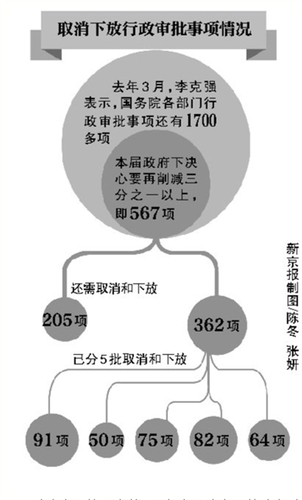 在国务院的带动下,去年3月至今分5批,取消和下放了362项行政审批项目。