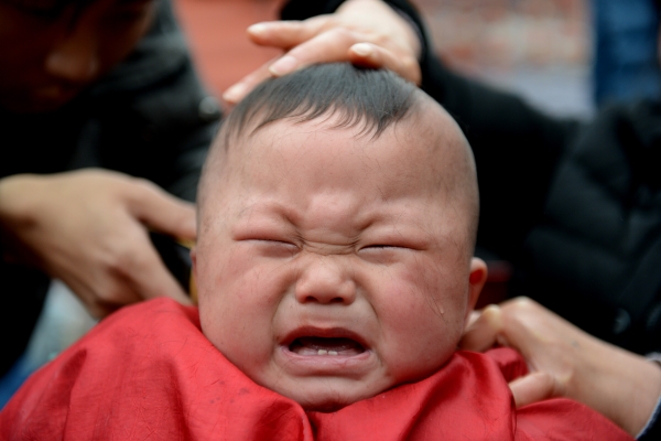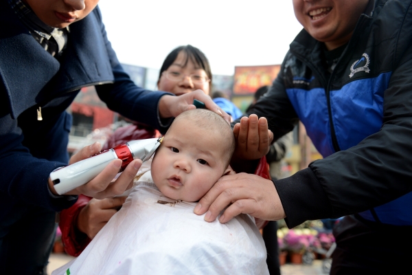 3月2日,在安徽省合肥市罍街广场上,理发师在为孩子剃头。新华社发