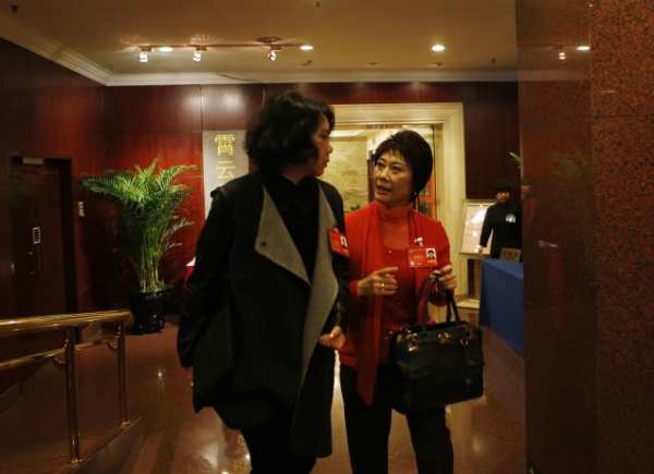 3月7日上午,在驻地北京国际饭店,吃完早餐的董圆圆委员(右)准备前往文艺界联组会会场。