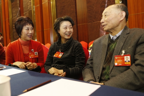 3月7日上午,在界别联组会上,董圆圆委员(左)与师傅梅葆玖(右)、师妹李胜素交流。