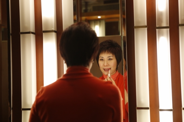 3月7日上午,全国政协委员董圆圆在镜子前补妆。