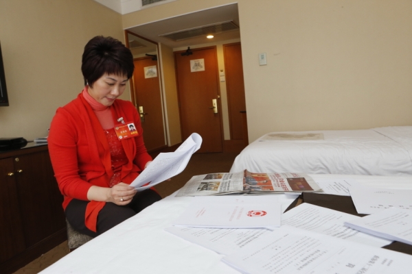 3月7日,董圆圆委员利用午休时间在驻地房间阅读会议材料。