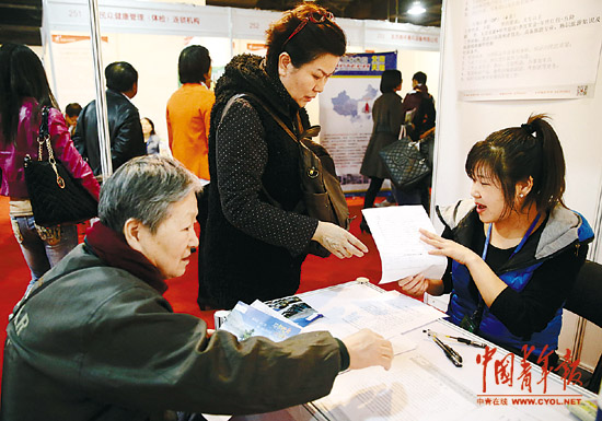 3月23日,首届全国跨区域(春季)校园巡回招聘“北京站”招聘会在中国国际科技会展中心举行,一位家长在帮孩子求职咨询。本报记者 陈剑摄