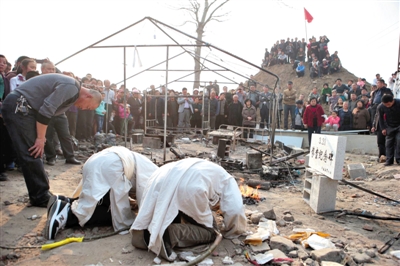 3月23日,青岛平度市杜家疃村,耿福林的出殡仪式,亲属在被烧毁的帐篷边祭拜。新京报记者 王嘉宁 摄
