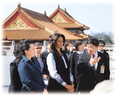 3月21日上午11时,米歇尔·奥巴马一行从午门西侧的西华门进入故宫博物院,在国家主席习近平夫人彭丽媛陪同下,在故宫游览了将近1个小时。