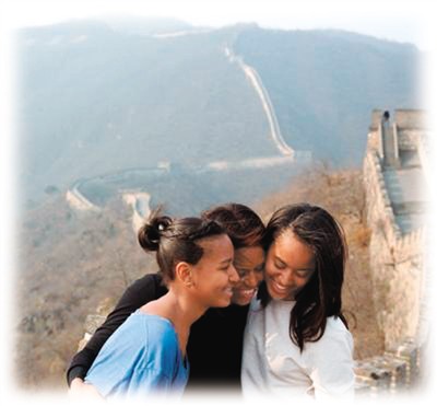 米歇尔登上长城兴奋地与孩子拥抱一起