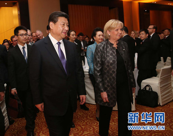 3月29日,国家主席习近平在杜塞尔多夫出席中德工商界举行的招待会并发表题为《把握中国机遇,实现共同发展》的重要讲话。这是习近平等步入招待会会场。新华社记者刘卫兵摄