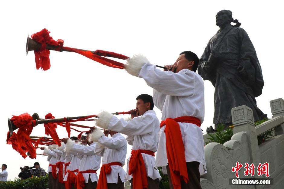 3月30日,在司马迁雕像前,几位乐手吹响了祭祀长号。张远 摄