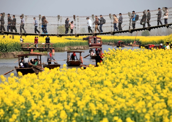 当日,江苏省兴化市千垛菜花风景区正式开园迎客。千垛菜花风景区港汊密集,河如阡陌。油菜花开,蓝天、碧水、“金岛”织就了“河有万湾多碧水,田无一垛不黄花”的绮丽画卷,美不胜收,吸引海内外游客前来一睹美景。