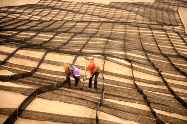 4月10日,临泽县农民在沙漠里布置尼龙网格固定沙丘,种植梭梭。