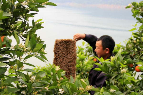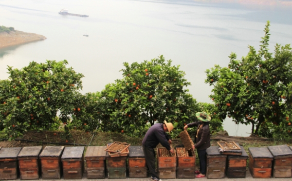 湖北省秭归县是三峡库区移民大县,为?;に粒孟夭扇∠盗写胧┓⒄沽止?。每年春天,峡江两岸30多万亩橘花盛开,移民看准商机在柑橘园里大力发展养蜂业。大量蜂群既为养蜂人带来了经济收入,又让柑橘授粉充分,为柑橘丰收打下了良好的基础,可谓一举多得。