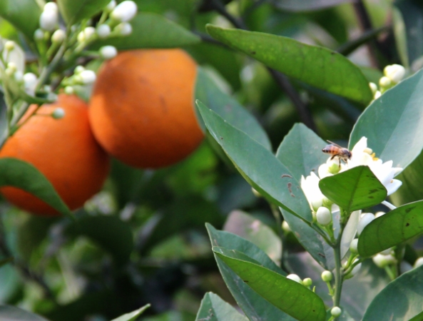 4月29日,在三峡库区湖北秭归县泄滩乡陈家湾村柑橘园里,蜜蜂在花丛中采集花粉。