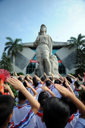 4月30日,少先队员在红色娘子军纪念馆瞻仰红色娘子军塑像。