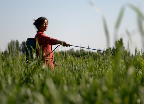 5月5日,在河北固安县四里铺村,农民在麦田喷施农药。