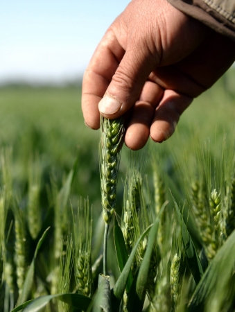 5月5日,在河北固安县四里铺村,农民在查看小麦长势。