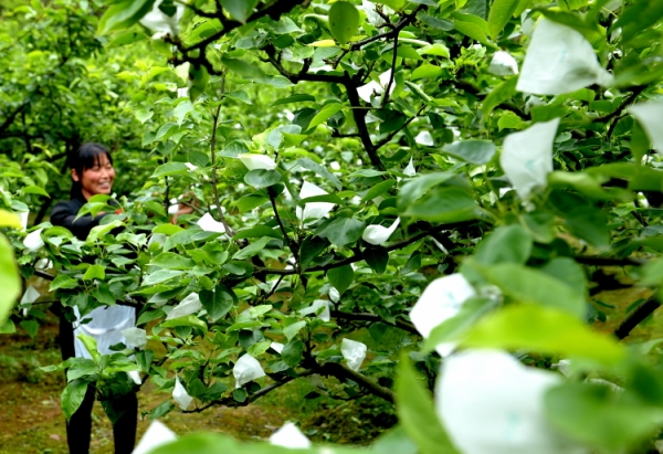5月5日,湖北省宣恩县椒园镇黄坪村农民在给黄金梨套袋。