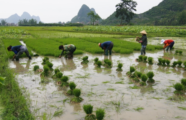 5月5日,在广西柳城县大埔镇三塘村保门屯,当地农民正在水田里劳作。