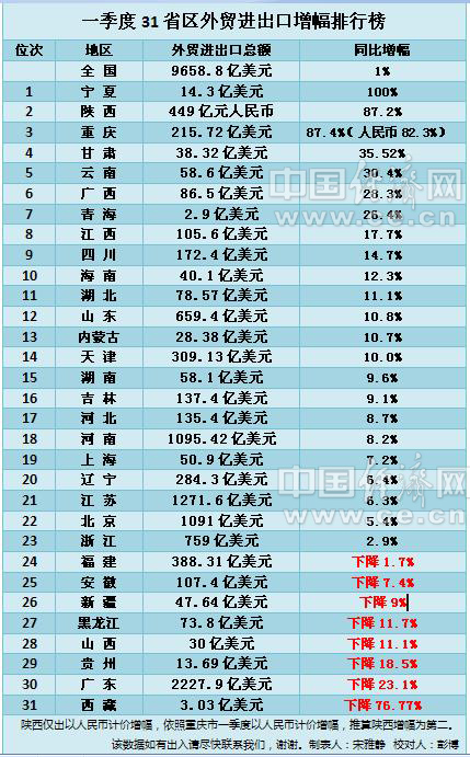 31省区2014年一季度外贸成绩单。该表数据均来自各地方统计局及海关。陕西仅出以人民币计价增幅,依照重庆市一季度以人民币计价增幅,推算陕西增幅为第二。制表人宋雅静 校对人彭博