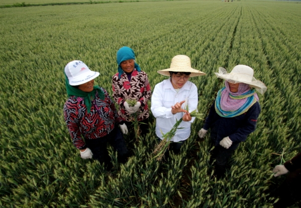 5月14日,在山东省郯城县一小麦良种繁育基地,郯城农业局农技推广员高建玲(右二)在为麦农讲解小麦良种去杂要点。