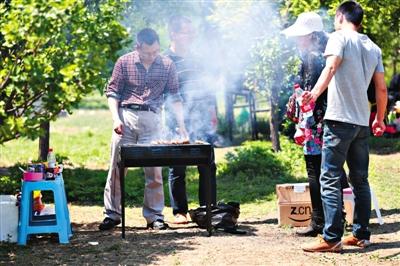 5月2日,昌平沙河水库,水坝南端东侧公园里,游客们露天烧烤。新京报记者 尹亚飞 摄