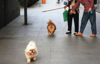 5月9日,慈云寺桥,两位遛狗的市民一个拴着狗绳,一个没拴狗绳。 新京报记者 薛珺 摄