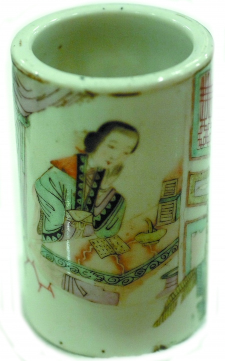 笔者收藏的这件粉彩仕女芭蕉图笔筒,乃瓷画名家所制,属晚清笔筒中的精品,具有很高的收藏价值,前不久,我在沪上一次拍卖会上,看到了一只与这件藏品相似的清代黄汝铭粉彩笔筒曾以近万元的高价成交。